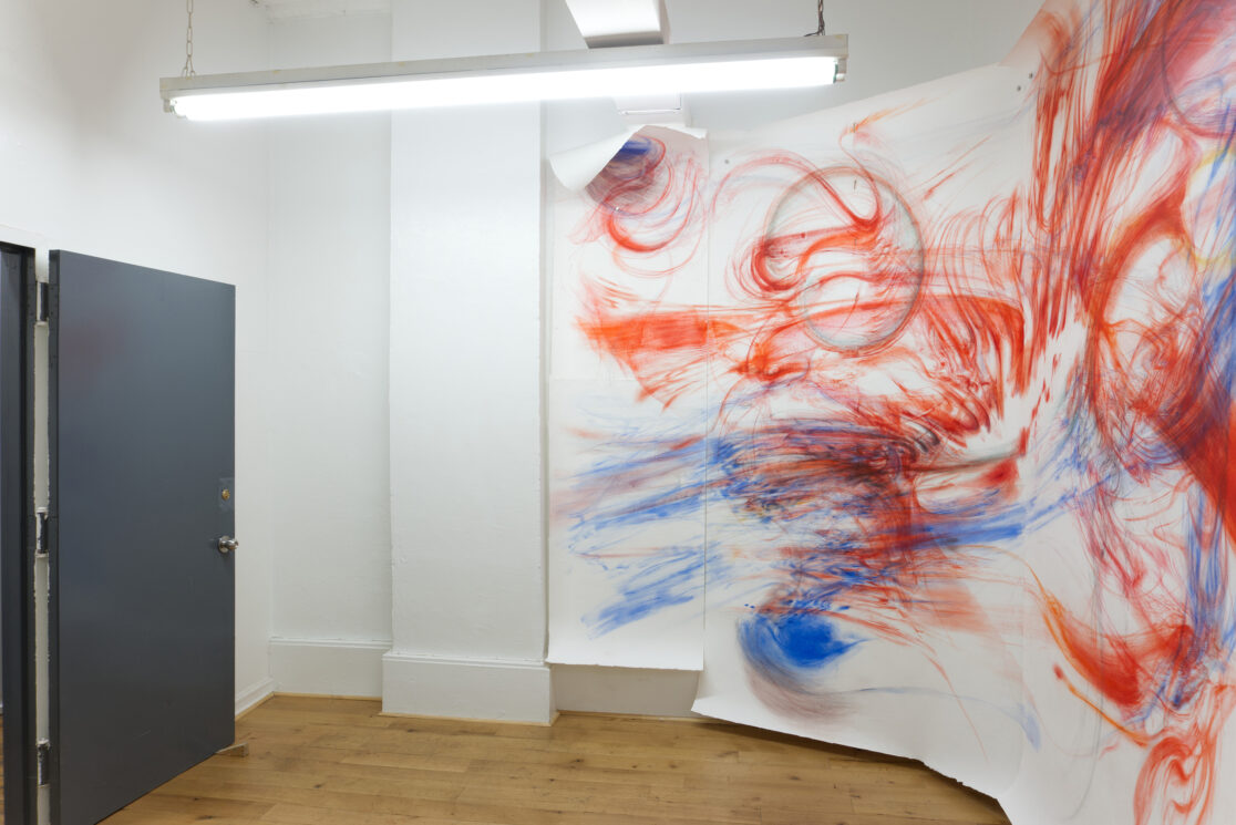 Drawing on the technique and materials used in calligraphy—the art of beautiful writing—Maria VMier’s ongoing Companion series moves beyond such codified sets of stroke patterns towards an unruly writing. In her vibrant, large-scale works with ink and pigment on paper, the gesture of writing appears without its usual written product; a writerly mark freed of constraints to produce legible signs. A gesture – Roland Barthes writes in an essay on Cy Twombly’s paintings – is “something like the supplement of the act.”(1) Whereas the act aims at a result, the gesture exceeds it as the sum of inexhaustible and indeterminate impulses and motives.