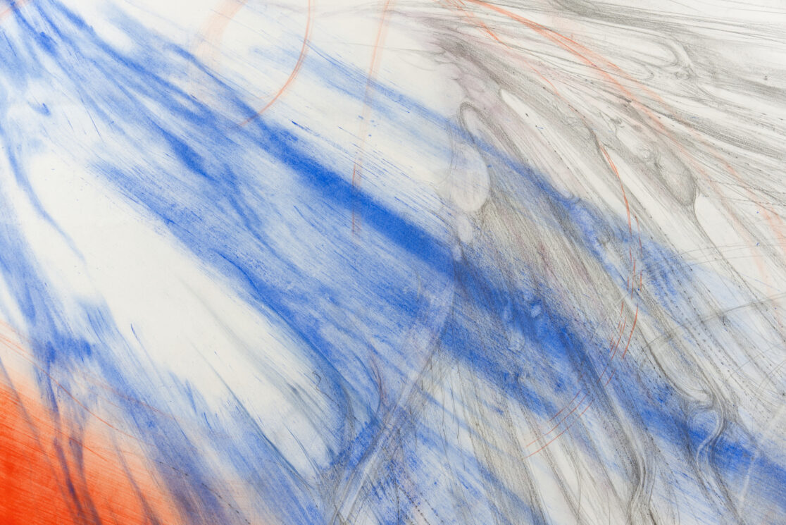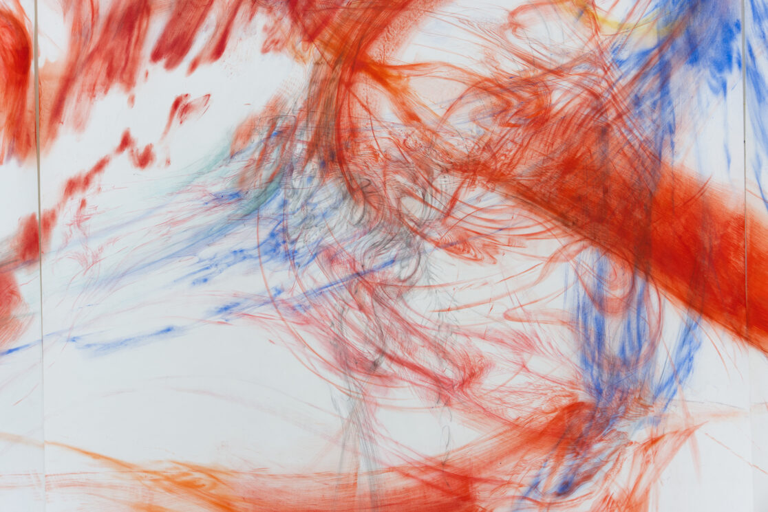 Rather than producing premeditated signs as in the act of writing, VMier’s gestural abstraction stages a material encounter between the bodily gesture, the pigments, the brushes, and the paper support. The writerly gesture responds to material resistances. Sweeping strokes flow over the paper plane like the pulsating veins of a body and intersect with punctuating, undulating marks. At times, the predominantly scarlet red and ultramarine blue pigments seem to hover over the surface. Elsewhere, thin strings of color blur into dissolving fields, as if to defy the borders that lines impose. The ink quickly seeps into the paper, a material condition which leaves traditional calligraphers no room for mistakes, hesitation, or doubt. The lines that compose VMier’s Companions appear more erratic than resolute. Strokes are overwritten and keep returning on themselves, forming a palimpsest in a monumental diary.