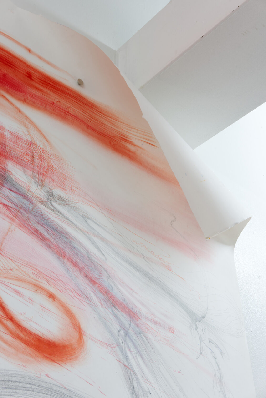 The writing body acts as a seismograph that records and reacts to quotidian events, experiences, and feelings. Produced in New York, this Companion transcribes what it is like to dwell in this tumultuous and tantalizing city, and the relentless confrontation of too-much in everything: from far distances to high prices to skyscraping architecture. In Out of Proportion, even gestures expand beyond their paper support, just as the panoramic paper struggles to fit in the exhibition space. Rather than representing the complexities of the present condition, VMier gestures towards it and translates it into a dynamic field of wander lines, “in order to make something other than a sign.”(2) And yet one cannot help but try to read it, following the lines like a map of underwater currents. These drawings are an invitation to drift in their writing which—instead of signifying the world trough codified and legible forms—traces the experience of moving through it.